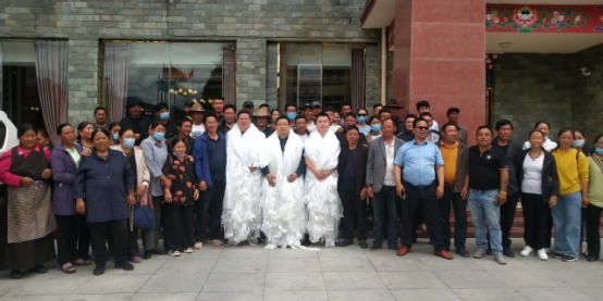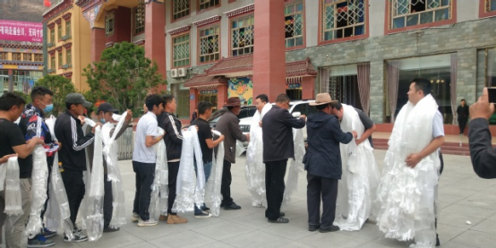 村民排队向三位扶贫干部献哈达