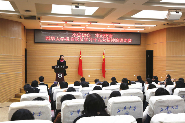 为进一步引导机关广大党员深入学习党的十九大精神,坚定理想信念,12月21日下午,学校机关党委在行政楼一楼报告厅举办了以“不忘初心,牢记使命”为主题的机关党员学习十九大精神演讲比赛。校党委书记边慧敏全程参与了本次基层党组织主题党日活动,党政办主任黄进,机关党委书记王代言,党委宣传部部长山述兰,党委学工部部长王大清,党委组织部副部长邱刚,党委政保部部长陈召平出席比赛并担任评委。来自机关党委各支部的16位选手参加了比赛。